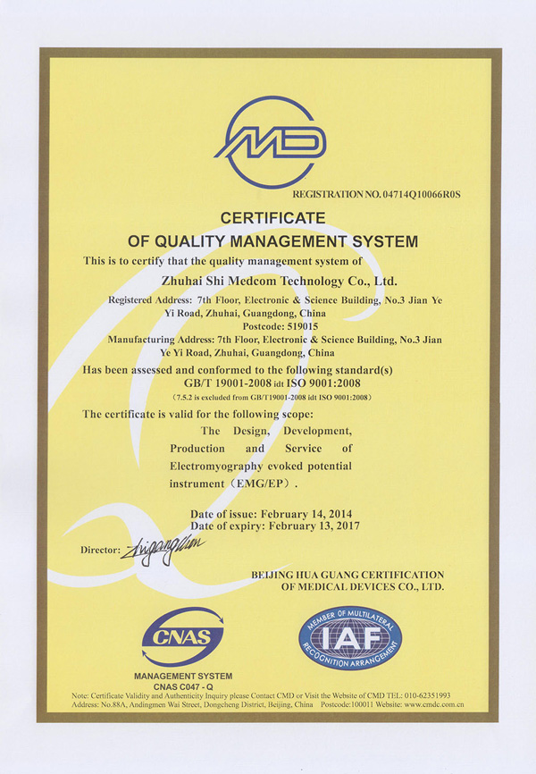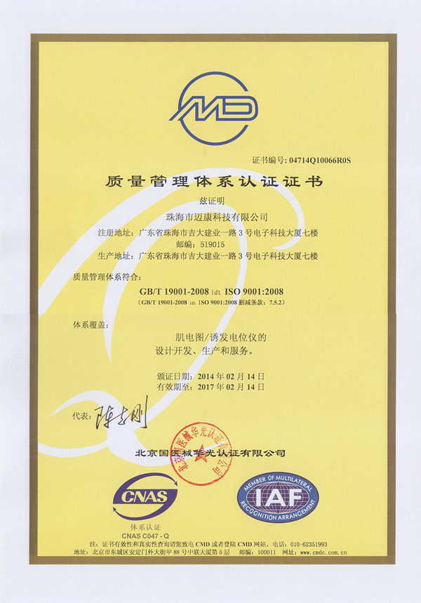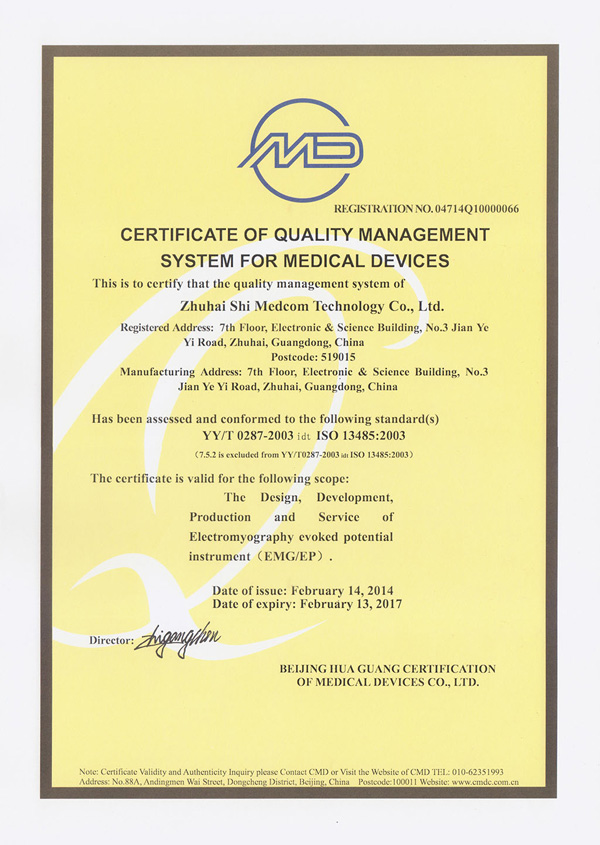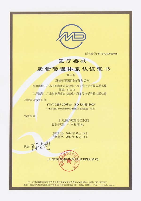 此两项质量管理体系认证的通过,进一步证明了登录入口在肌电图/诱发电位仪的设计、开发、生产和服务上的高质量水平,为持续向顾客提供质量优异的产品与服务做出了有力的保障。